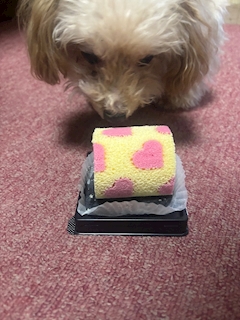 こんばんは! うちの子の誕生日の日 なにもできなかったので この前ケーキを買いに☺️ 誕生日ケーキが無かったので、、 ロールケーキで🐶 少食すぎるので こんなに小さいのでも 3回にわけてあげました😌 ケーキ無くなってからしばらくは 普通のご飯を食べたくないって 態度してたので 大変だった😂😂