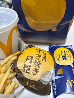ゆかです😉 Uberで注文🍔🍟🌕 🍔はお肉が多かって残しちゃった… 月見パイが美味しかった🩷 今日は早朝からゴルフ⛳️ 3ヶ月ぶりなので当たるか心配ですが🤭 一年ぶりに回るメンバーなので 楽しみたいと思います😉