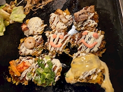 名物らしいプチお好み焼き可愛い❤味は普通ですw にこちゃん☺頂きました☺ ガリガリ君チューハイ乾杯🍺🎶🍺🎶🍺 鉄板焼き暑いから丁度いい👍 明石焼きみたいな出汁に付けて食べるやつが美味しかった~😋 5人で結構食べて飲みました~🎵 道頓堀にあるお店なので外国人の方や若い人に人気のお店みたいです✨ ご馳走様でしたo(^o^)o