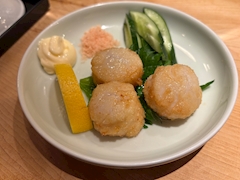ゆかです😉 先日美樹ママと🩷 お店の斜め前にあるお寿司やさんへ 珍しいホタテの唐揚げ かに酢 芽ねぎ、はまち 美樹ママははまちと中トロ 追加で中トロと鰻 貝の味噌汁 ごちそうさまでした😋 あと一日よろしくお願いします😚 おやすみなさい💤